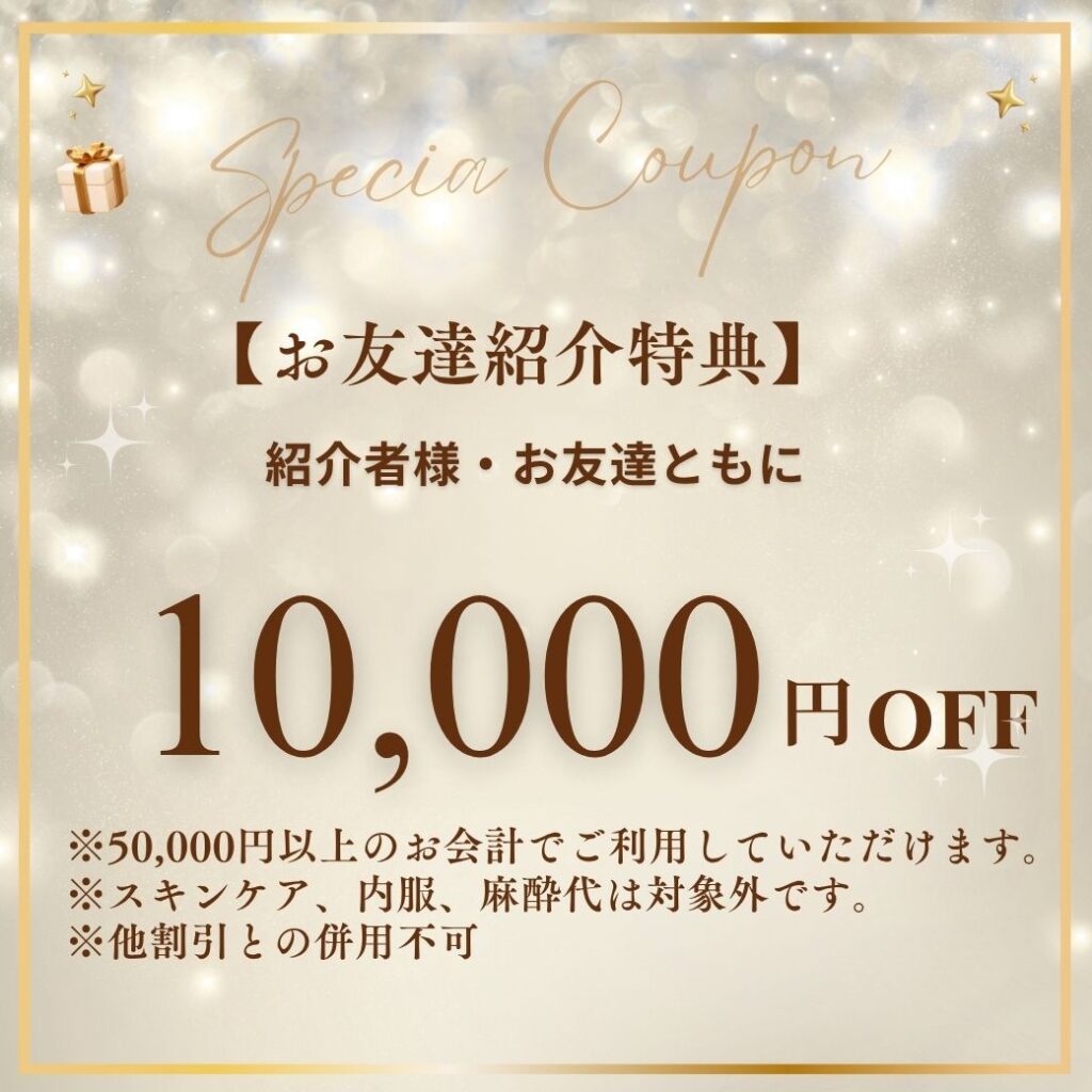 施術を受けられたお客様(※カウンセリングのみは対象外)が、新規のお友達をご紹介いただき、そのお友達が初めてのご来院時に50,000円(税込)以上の施術を受けられた場合、ご紹介者様とお友達の両方に10,000円OFFクーポンをプレゼントいたします✨